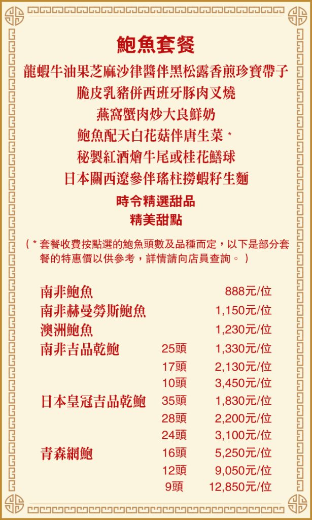 在眾多套餐中,鮑魚套餐甚受歡迎。食客不僅能品嘗「舊貨」的珍味,更可依照個人口味選擇不同頭數及品種的鮑魚作為主角。試想像,一邊欣賞維港煙花滙演,一邊細嘗自選鮑魚佳餚,何其賞心樂事。