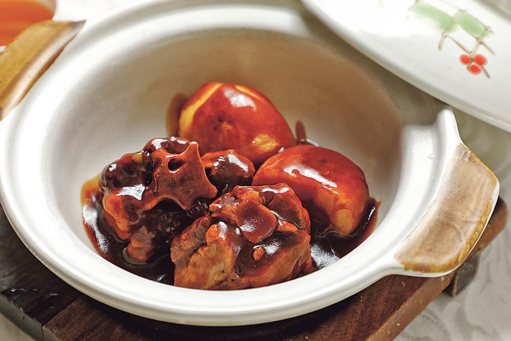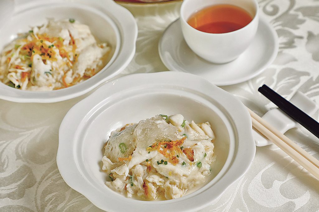另一道「燕窩蟹肉炒大良鮮奶」更是經典炒大良牛乳的升級版,其燕窩晶瑩剔透,蟹肉鮮美細膩,與大良鮮奶的醇厚交織,入口即化,清新滋潤。招牌菜「鮑魚配天白花菇伴唐生菜」則以厚實的鮑魚與花菇的清香相互輝映,唐生菜的爽脆為整道菜添上清新筆觸。