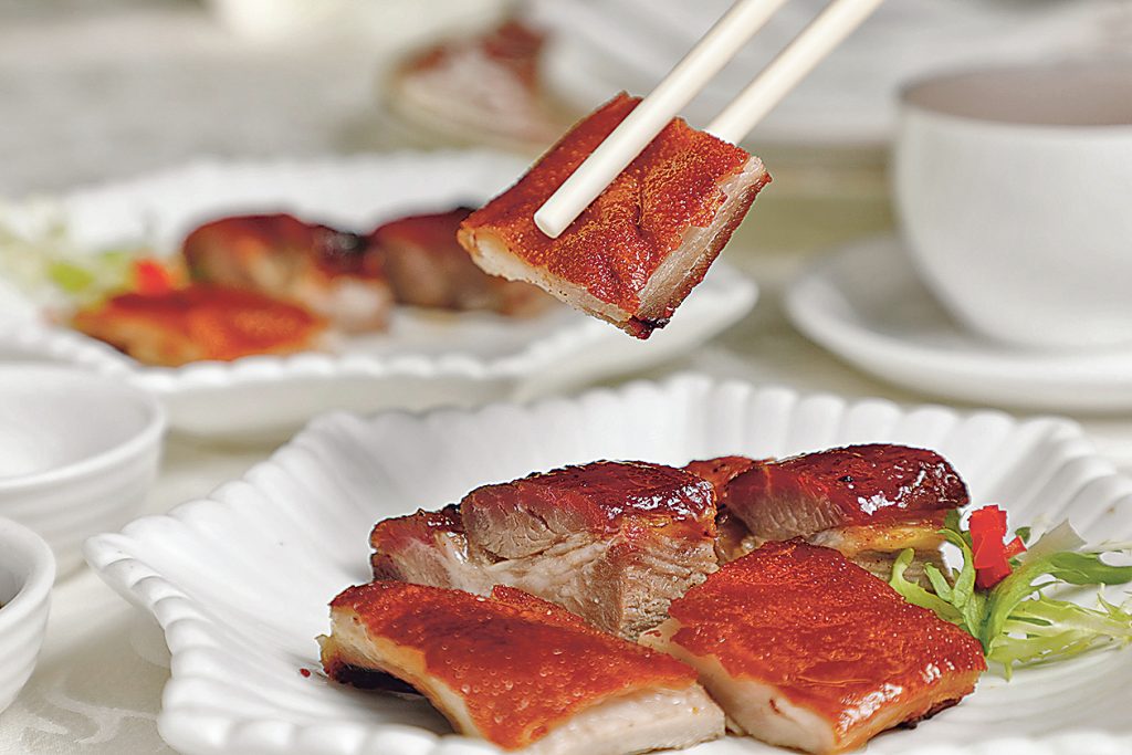 鮑魚套餐同時融入多款矜貴食材,化作層次豐富的美味。譬如「龍蝦牛油果芝麻沙律醬伴黑松露香煎珍寶帶子」,芝麻沙律醬的香氣與龍蝦肉的鮮甜交織,再加上黑松露與煎至金黃的珍寶帶子,外觀華貴,味道更添層次;隨後登場的「脆皮乳豬併西班牙豚肉叉燒」,其乳豬皮脆如秋葉,油香四溢,而西班牙豚肉則以中式烤製手法呈現軟腍口感,兩者相映成趣。